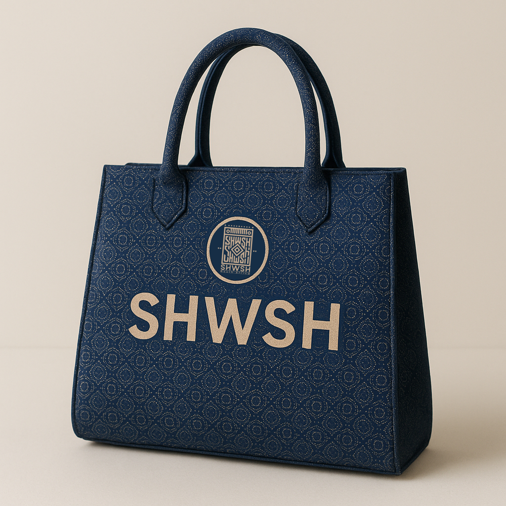 Meet your office essential with African attitude. Extra-large tote bag with neutral Shweshwe, padded handles, and organizational pockets.